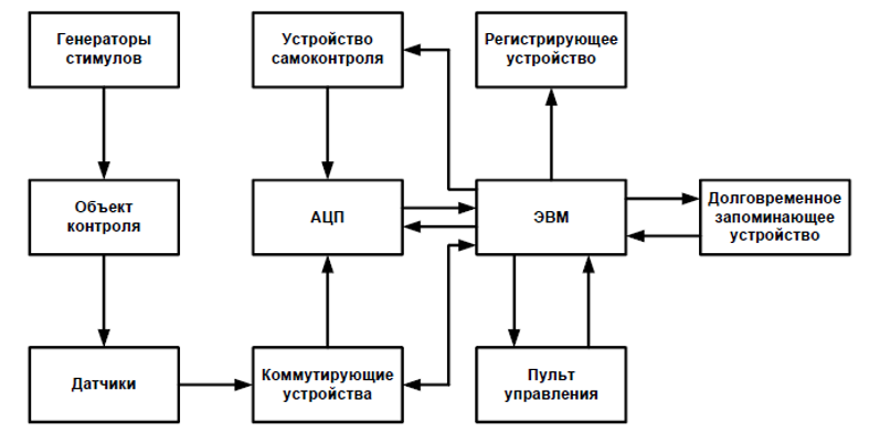 В самом общем виде в состав автоматизированной системы контроля входят измерительные, анализирующие (обрабатывающие, вычислительное), индикаторные и управляющие устройства (рис.2).